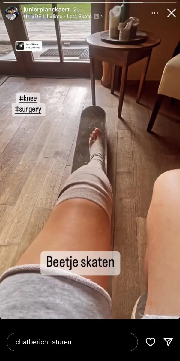 Op zijn Instagramverhaal deelt hij daar nu de eerste beelden van. In het filmpje zien we hem een oefening doen waarvoor hij een skateboard nodig heeft. Zo kan hij gemakkelijk zijn been strekken. “Beetje skaten”, schrijft Junior erbij. Hij bekijkt het dus nog positief!