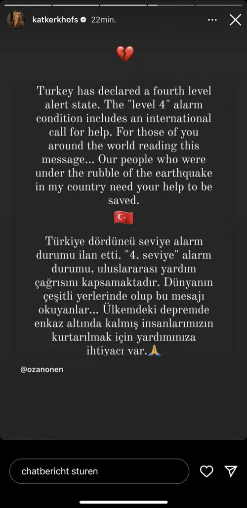 “De alarmtoestand omvat een internationale omroep voor hulp. Onze mensen die onder het puin van de aardbeving in mijn land liggen, hebben uw hulp nodig om gered te worden”, staat er te lezen. Kat is erg aangedaan door dit trieste nieuws. Op haar Instagramverhaal plaatst ze dan ook een gebroken hartje boven de boodschap.