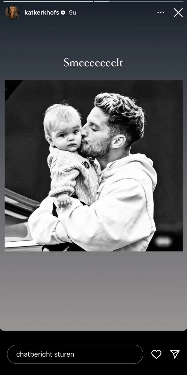 Vervolgens plaatst ze ook nog een tweede foto waarop de trotse papa een dikke zoen op de wang van Ciro Romeo geeft. Kat is helemaal gek van haar man en haar zoontje en dat mag iedereen weten. “Smelt”, schrijft ze erbij.