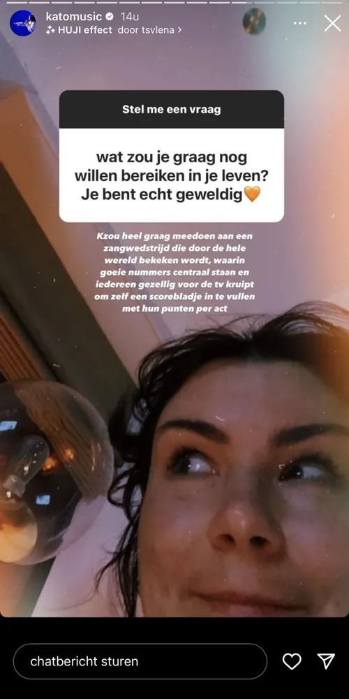 Tijdens een vragenrondje op Instagram krijgt ze de volgende vraag van een fan: “Wat zou je graag nog willen bereiken in je leven?” Daar geeft Kato meteen een duidelijk antwoord op: “Ik zou heel graag meedoen aan een zangwedstrijd die door de hele wereld bekeken wordt, waarin goeie nummers centraal staan en iedereen gezellig voor de tv kruipt om zelf een ‘scorebladje’ in te vullen met hun punten per act.”