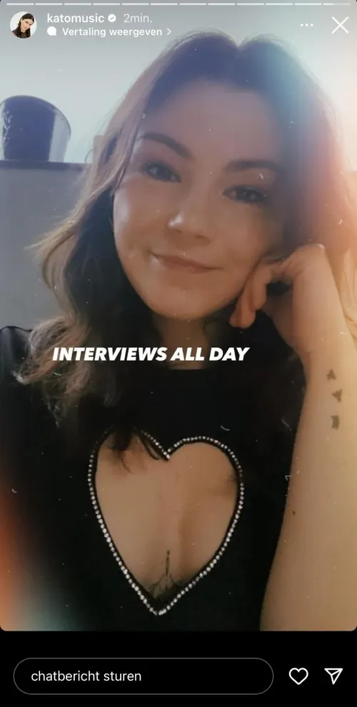 De 'Eurosong'-kandidaten hebben nu ook nog heel wat interviews op de planning staan. Dat laat ook Kato zien op haar Instagramverhaal. “De hele dag interviews”, schrijft ze bij een uitdagend plaatje. De zangeres plaatst een selfie waarop ze een bijzondere outfit draagt die weinig verhullend is. Zo heeft ze een zwart topje aan dat een uitgesneden decolleté heeft in de vorm van een hartje.