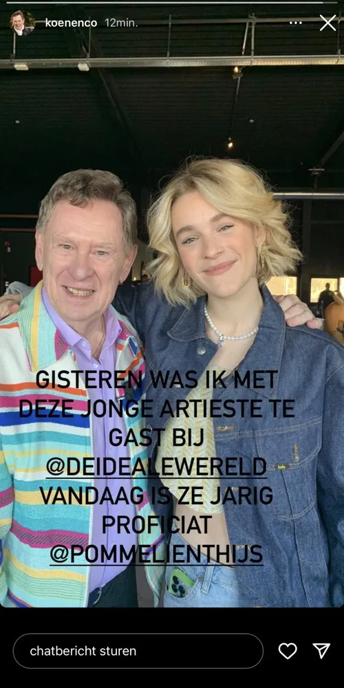 “Gisteren was ik met deze jonge artieste te gast bij ‘De ideale wereld’”, schrijft hij bij een leuke foto van hun tweetjes. “Vandaag is ze jarig, proficiat Pommelien Thijs”, voegt Koen er nog aan toe.