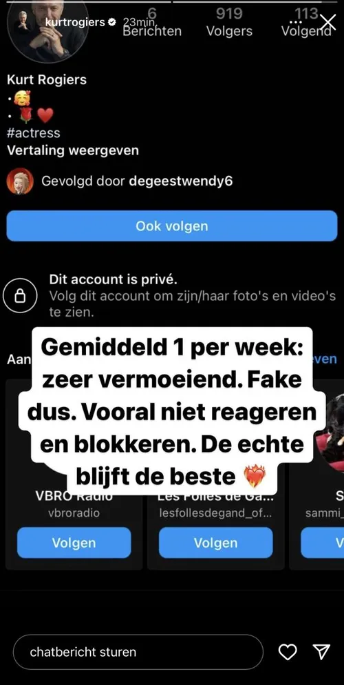 Op zijn Instagramverhaal laat hij nu weten dat hij het er helemaal mee heeft gehad. “Gemiddeld één keer per week”, schrijft hij bij een screenshot van zo’n fake account. “Zeer vermoeiend”, aldus de acteur. Daarnaast waarschuwt hij ook nog zijn volgers. “Fake dus, vooral niet reageren en blokkeren”, klinkt het.