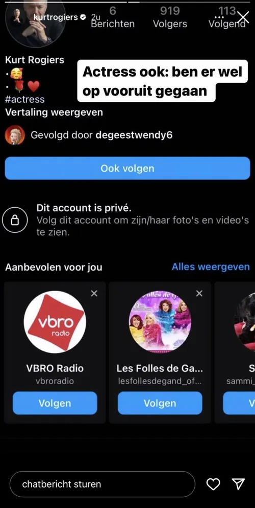 "De echte blijft de beste", besluit hij. Toch kan Kürt het niet laten om er nog een grapje over te maken. Zo staat op het nepprofiel ‘actrice’ in plaats van ‘acteur’. “Actrice ook, ben er wel op vooruit gegaan”, zegt hij al lachend.