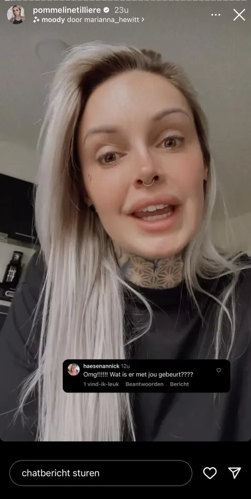 “Ik krijg weeral zoveel verzuurde haatreacties”, zegt Pommeline al zuchtend op haar Instagramverhaal. “Laat mij gewoon zijn wie ik ben. Al heb ik eens een Brazilian butt lift gedaan, al ben ik vijftien kilogram bijgekomen, al heb ik mijn neus laten corrigeren... Laat mij gewoon fucking gerust”, bijt ze fel van zich af. "Ga uw frustraties ergens anders uitwerken", zegt ze.