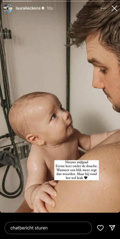 Zo laat de mama weten dat ze een nieuwe mijlpaal te vieren hebben. “Eerste keer onder de douche”, klinkt het trots. Ze deelt ook meteen een erg schattig kiekje van Eben en zijn papa. “Wanneer een blik meer zegt dan woorden”, aldus Laura. “Maar hij vond het wel leuk”, besluit ze.