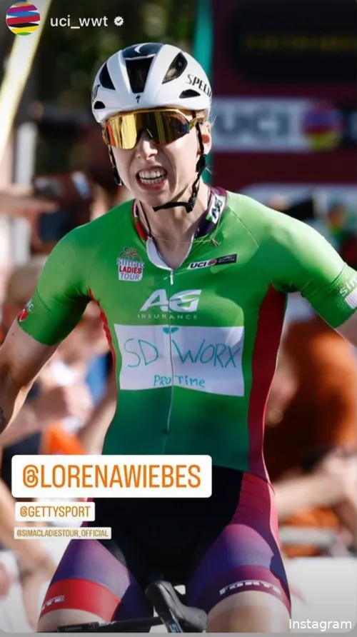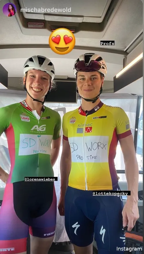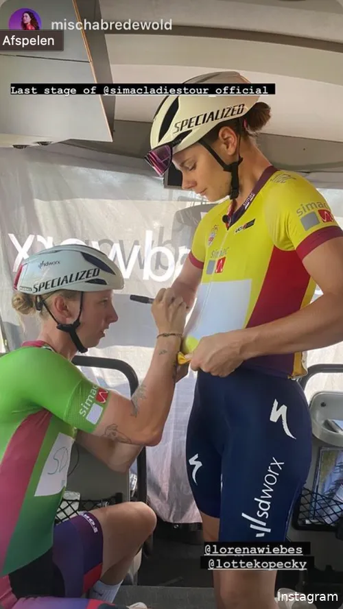 SD Worx tegen zondag iets op gevonden. Kopecky en Wiebes - die de groene puntentrui droeg - schreven namelijk zelf ‘SD Worx Pro Time’ op hun truitjes. Voor het eindpodium hadden ze zelfs een SD Worx-sticker meegenomen die Wiebes aanbracht op het truitje van Kopecky. Stel je eens voor dat dit in het mannenpeloton in pakweg de Renewi Tour zou gebeuren...