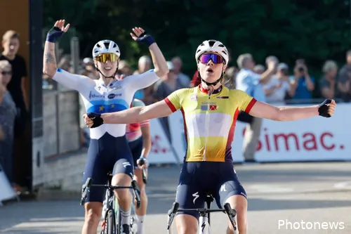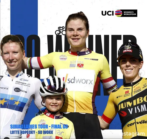 Ze won vorige week de tijdrit in Leuven en sprong zo meteen naar de kop van het klassement. Lotte moest haar wereldkampioenentrui dus inwisselen voor de gele leiderstrui van de Simac Ladies Tour. De aandachtige kijker merkte zaterdag - toen ze haar tweede rit won - op dat er geen teamnaam op de leiderstrui gedrukt stond.