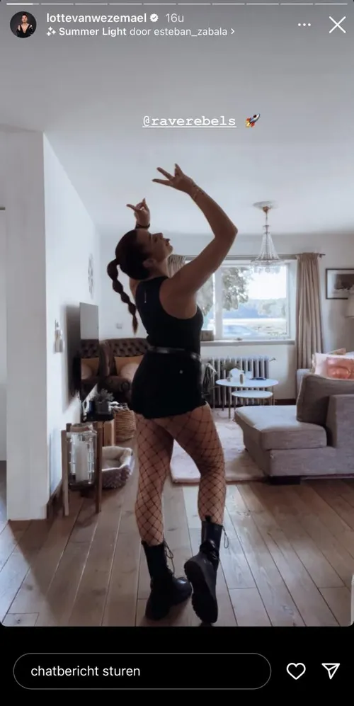 Lotte toonde al in de middag aan haar volgers wat ze ging aantrekken naar de rave. En het mag gezegd worden, het is een speciale look. 'Seksuolotte' draagt namelijk niet veel kleren. Zo heeft ze een heel kort shortje aan met panties die weinig van haar benen bedekken. Ook draagt ze haar haar in een bijzondere paardenstaart.