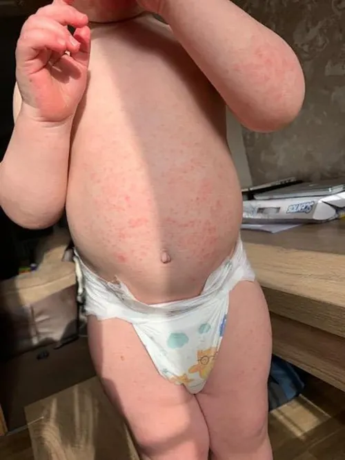 Voorts kreeg hij ook rode uitslag op zijn buik en gezicht, vertelt zijn moeder. Van de dokters in het ziekenhuis kreeg ze aanvankelijk te horen dat het na enkele dagen zou genezen, maar dat bleek niet het geval. De uitslag werd zelfs nog erger. Een groot deel van zijn lichaam zag felrood.
