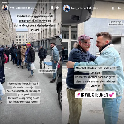 Zij staan in voor de voedselbedeling van minderbedeelden. Gisteren gingen Mathias en Lynn samen met hen vers bereide maaltijden uitdelen in onze hoofdstad. “Mensen slapen buiten, het was -8 graden deze nacht… Vreselijk”, schrijft Lynn aangedaan op Instagram. “Weer meteen met beide voeten op de grond gezet. Het warme eten op zondag is echt een lichtpunt voor deze mensen”, beseft ze maar al te goed.
