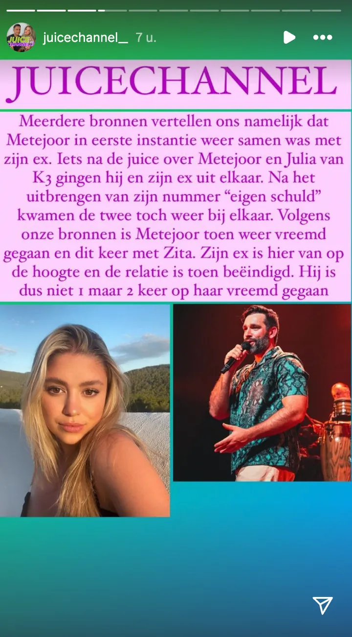 "Na het uitbrengen van zijn nummer 'Eigen schuld' kwamen de twee toch weer bij elkaar. Volgens onze bronnen is Metejoor toen weer vreemd gegaan en dit keer met Zita. Zijn ex is hiervan op de hoogte en de relatie is toen beëindigd. Hij is dus niet één maar twee keer vreemdgegaan."