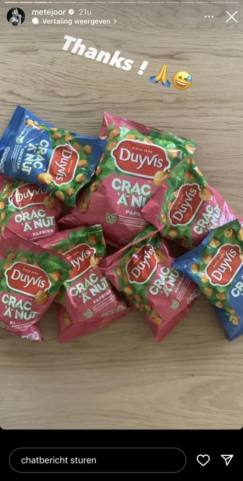 “Wat als je op nationale televisie zegt dat je van nootjes houdt en het enkele weken later de allereerste ‘fandag’ is”, schrijft hij op zijn Instagramverhaal. Je kan het al wel raden, hij werd namelijk verrast door zijn fans die allemaal hetzelfde hadden meegebracht naar het evenement. Daar plaatst hij ook meteen een foto van.