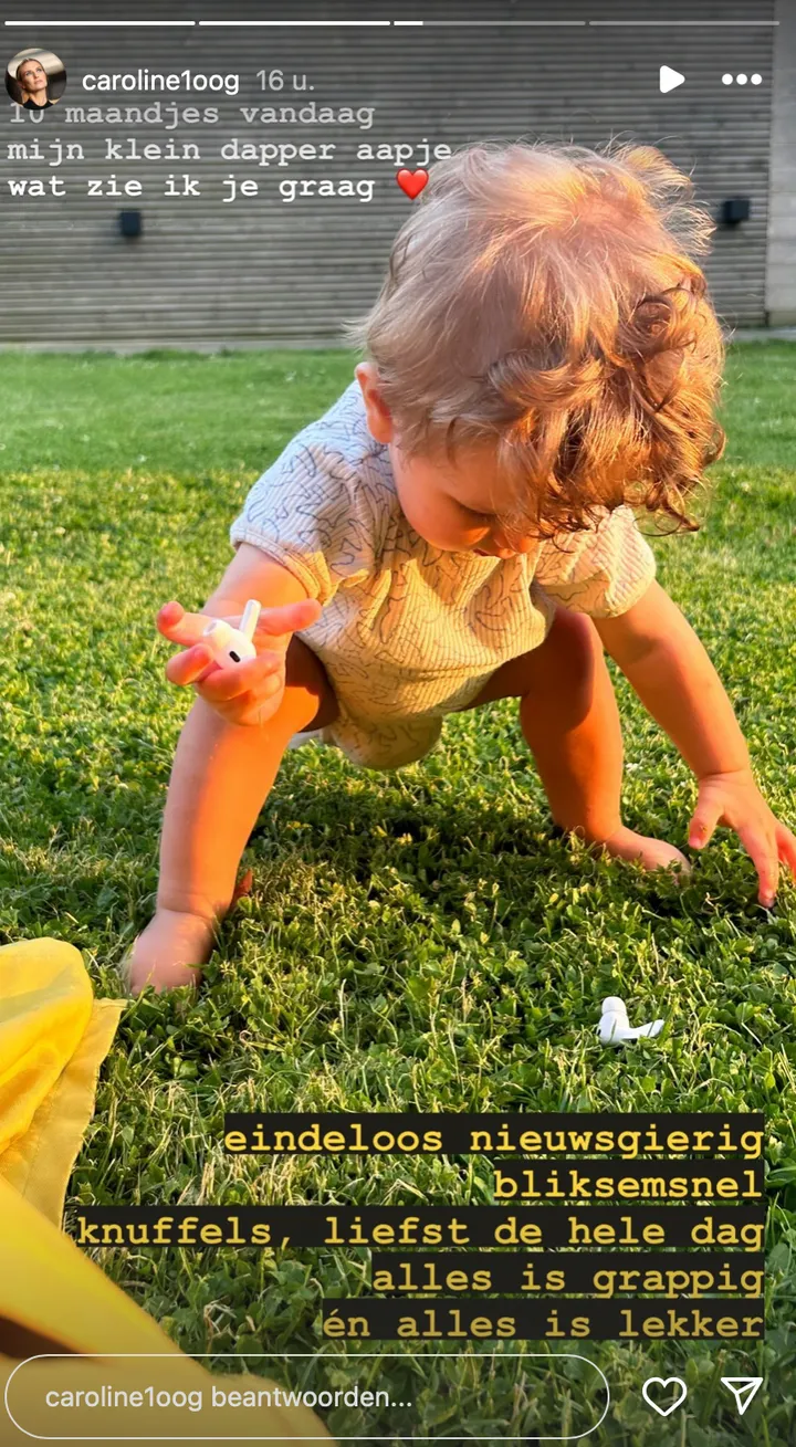 "Tien maandjes vandaag. Mijn klein dapper aapje, wat zie ik je graag", klinkt het op Instagram. "Eindeloos nieuwsgierig, bliksemsnel, knuffels, liefst de hele dag, alles is grappig, alles is lekker", klinkt het.