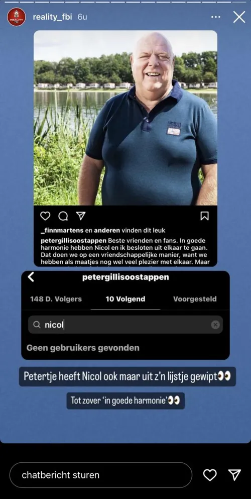 Toch stelt het Nederlandse juicekanaal reality_fbi nu vast dat er hoogstwaarschijnlijk toch een haar in de boter zit bij Peter en Nicol. Zo volgt Peter namelijk zijn ex niet langer op Instagram. “Peter heeft Nicol ook maar uit z’n lijstje gewipt”, zegt reality_fbi. “Tot zover ‘in goede harmonie’”, klinkt het.