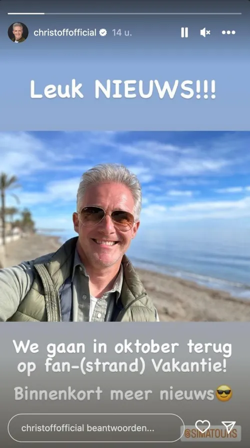 “Leuk nieuws!”, laat hij weten op zijn Instagramverhaal. Naar goede gewoonte trakteert Christoff zijn trouwste fans eind dit jaar weer op een gezellige vakantie samen. “We gaan in oktober weer op fanreis”, kondigt de zanger dolenthousiast aan.