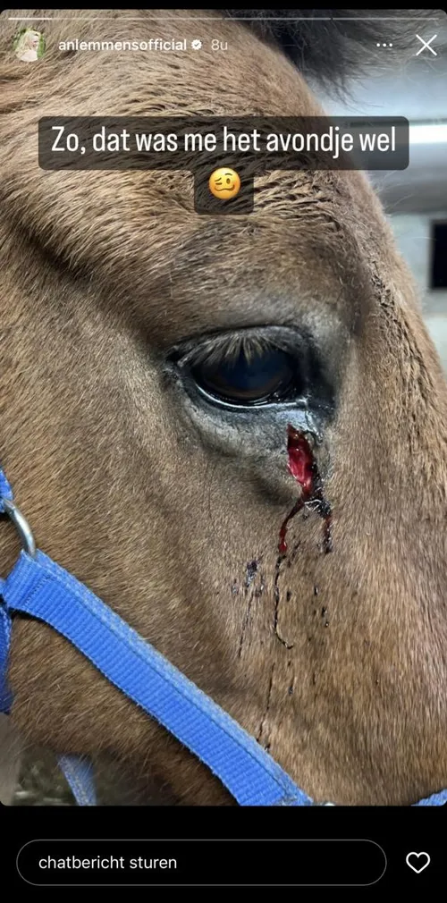 Ze laat zien dat haar paard een open wonde heeft onder het oog. Daarna toont An dat het paard verzorgd wordt en enkele hechtingen krijgt. “Een subtiele ooglidcorrectie”, noemt An het.