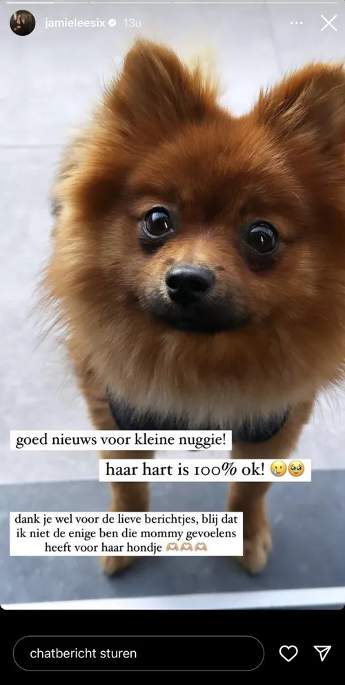 Een harde klap voor Jamie-Lee. “Al uren geweend, maar hoop dat alles oké is met deze kleine”, klonk het hoopvol. Nu, enkele dagen later, geeft ze eindelijk een update over haar mini-pomeriaan. “Goed nieuws voor kleine Nuggie!”, schrijft ze. “Haart hart is 100% ok!”, klinkt het opgelucht.