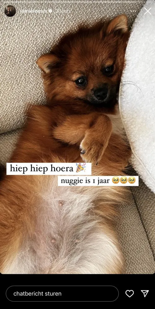 “Dank je wel voor de lieve berichtjes, blij dat ik niet de enige ben die mommy gevoelens heeft voor haar hondje”, voegt ze er nog aan toe. Bovendien heeft ze nog meer leuk nieuws. “Hiep hiep hoera, Nuggie is 1 jaar”, aldus Jamie-Lee. Nu kunnen ze de verjaardag vieren zonder stress over haar gezondheid.