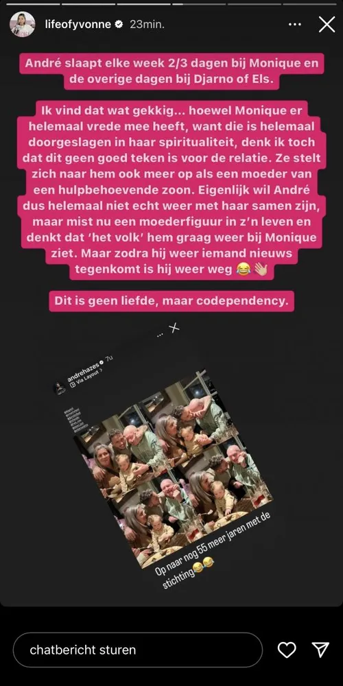 De tattoo zou zelfs geschreven zijn door Monique, maar Yvonne Coldeweijer denkt dat het toch niet goed gaat tussen de twee. “André slaapt elke week twee à drie dagen bij Monique en de overige dagen bij Djarno of Els”, schrijft de roddelkoningin op haar Instagramverhaal. Ondanks dat Monique dat oké vindt, lijkt dat toch geen goed teken te zijn voor hun relatie.
