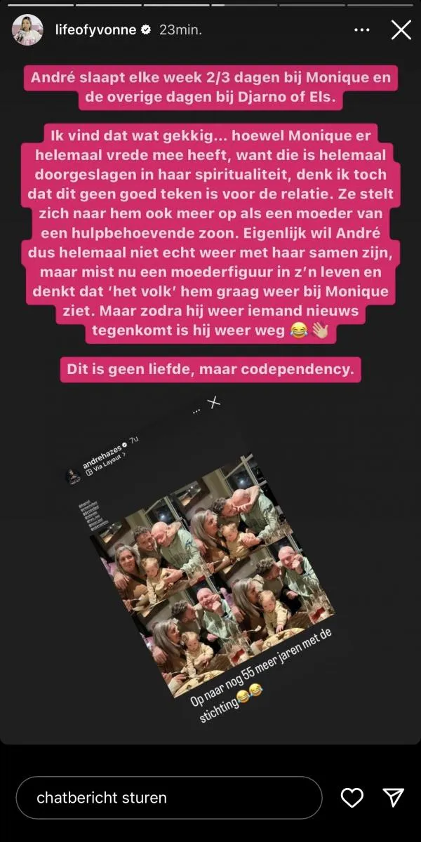 “Ze stelt zich naar hem ook meer op als een moeder van een hulpbehoevende zoon”, klinkt het. Daarnaast zou André ook helemaal niet samen willen zijn met Monique, maar blijft hij bij haar omdat hij een moederfiguur mist en het publiek dat van hem verwacht. “Maar zodra hij weer iemand nieuw tegenkomt, is hij weer weg. Dit is geen liefde, maar codependentie”, besluit Yvonne.