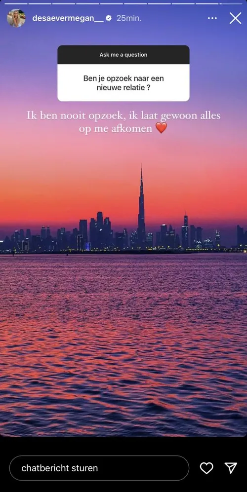 Dennis is terug naar huis vertrokken en Megan vertoeft momenteel nog steeds in Dubai. Tijdens een vragenronde op Instagram laat ze ook weten hoe het nu in de liefde gaat. “Ben je op zoek naar een nieuwe relatie”, vraagt een van haar volgers. “Ik ben nooit op zoek”, antwoordt ze. “Ik laat gewoon alles op me afkomen”, aldus Megan.
