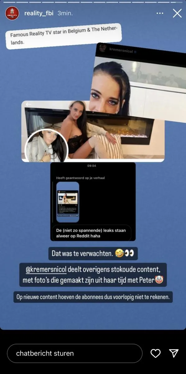 “Volg me vanaf nu ook op OnlyFans”, klinkt het enthousiast op sociale media. Echter onthult reality_fbi nu dat de content die Nicol al op het platform heeft gepost intussen al is uitgelekt op Reddit. Wat blijkt? Die is helemaal niet zo spannend. “Ze deelt overigens stokoude content, met foto’s die gemaakt zijn uit haar tijd met Peter”, meldt het juicekanaal. “Op nieuwe content hoeven de abonnees dus voorlopig niet te rekenen”, aldus reality_fbi.