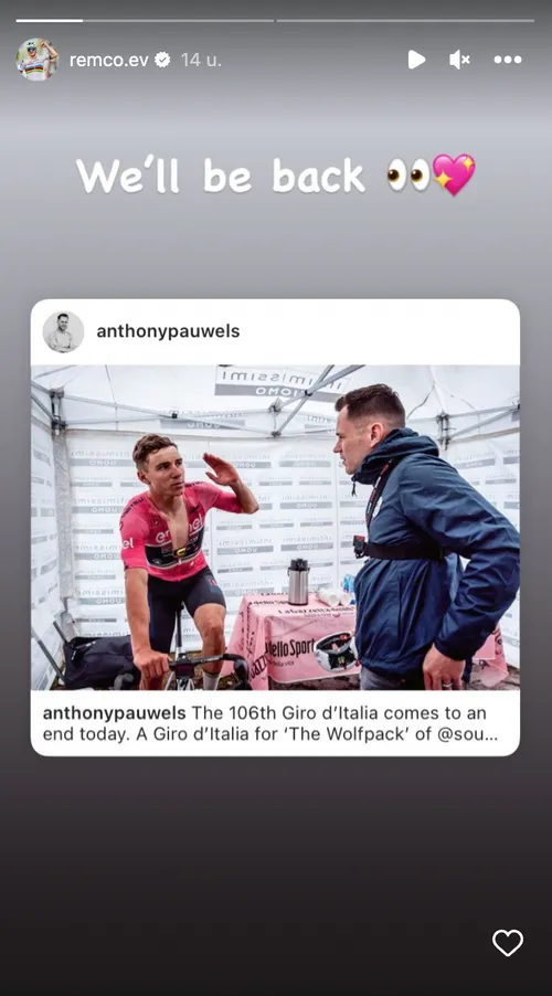 Toch zal Evenepoel terugkeren naar het land. Dat maakte hij zelf bekend via Instagram. Hij deelde een Giro-post van verzorger Anthony Pauwels, met daarbij de tekst: “We’ll be back.” Hij plaatste er ook nog een roos hartje bij. Ooit wil hij dus in het roze staan op het eindpodium.