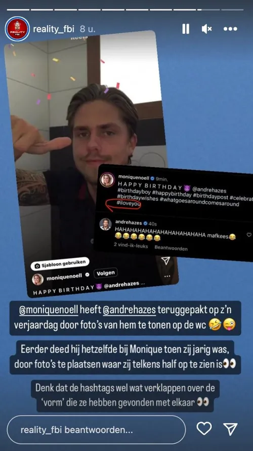 Of André en Monique nu weer samen zijn of niet, ze lijken het nog steeds goed met elkaar te kunnen vinden. Monique voegt zelfs de hashtag ‘I love you’ toe aan haar bericht. “Ik denk dat de hashtags wel verklappen welke ‘vorm’ ze hebben gevonden met elkaar”, denkt Reality FBI erover.