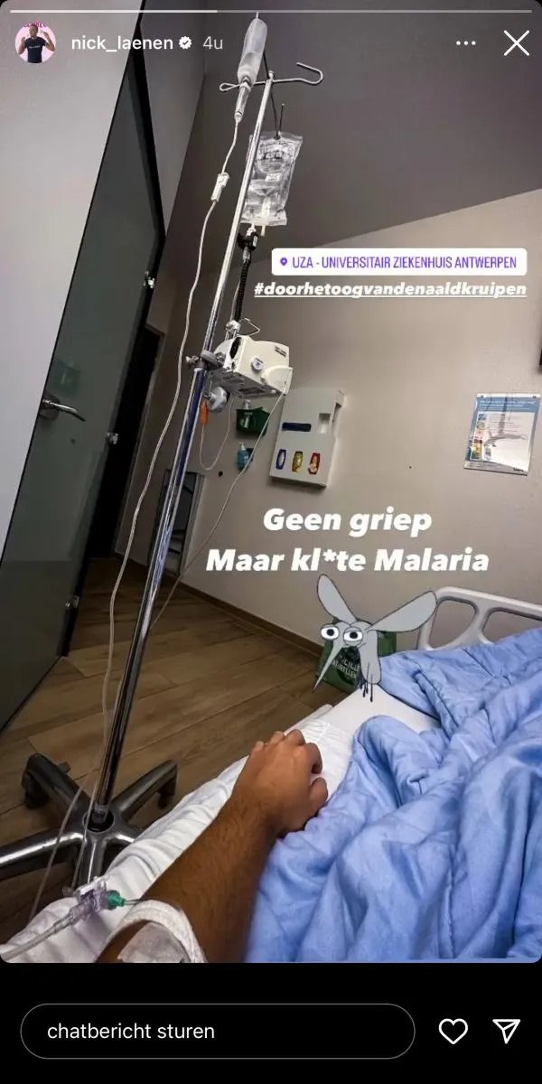 Nu is hij met spoed opgenomen in het ziekenhuis en volgens hem is hij door het oog van de naald gekropen. “Het is geen griep, maar klote malaria”, schrijft hij op zijn Instagramverhaal. Momenteel wordt hij daarvoor behandeld in het UZ Antwerpen. Hoe het nu juist met hem gaat is nog niet duidelijk.