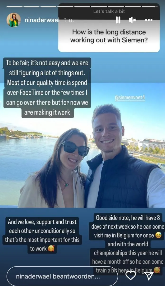 Op Instagram kreeg Nina de vraag hoe het met haar langeafstandsrelatie gaat. "Eerlijk gezegd is het niet gemakkelijk en moeten we nog heel wat uitzoeken", vertelt ze openhartig. "Onze qualitytime bestaat uit FaceTime-gesprekjes of de weinige keren dat ik hem ga bezoeken", gaat de olympisch kampioen verder.