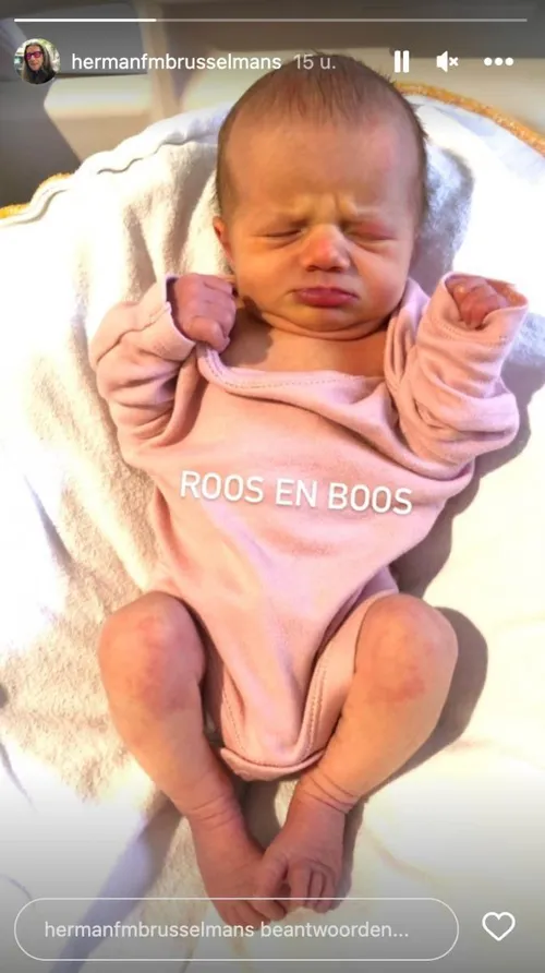 In tegenstelling tot Herman zelf, die we meestal in het zwart gekleed zien, is de kleine Roman iets kleurrijker ingeduffeld. Zijn zoontje schittert voor zijn eerste foto in een roze body. Maar of het hem zint, dat laten we aan hem over. “Roos en boos”, lacht de kersverse papa bij het kiekje.