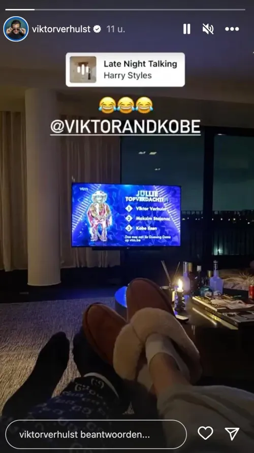 Staan Viktor en Kobe ook bovenaan op jouw verdachtenlijstje? Begin ze dan maar stilaan te schrappen. De zoon van Gert Verhulst heeft vrijdag namelijk een foto van de uitzending van ‘The Masker Singer’ op zijn Instagramverhaal geplaatst. Daar lacht hij duidelijk met het feit van dat hij en goede vriend Kobe in de top 3 verdachten voor Leeuw staan.