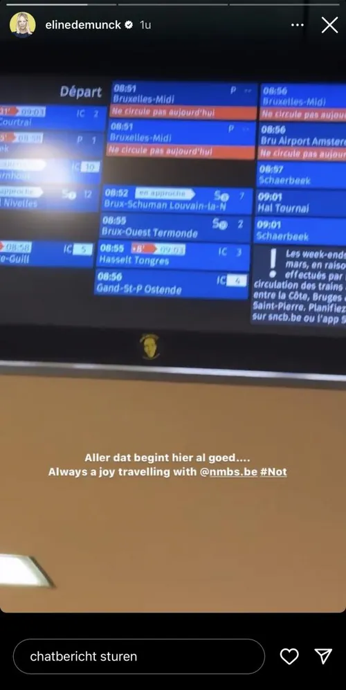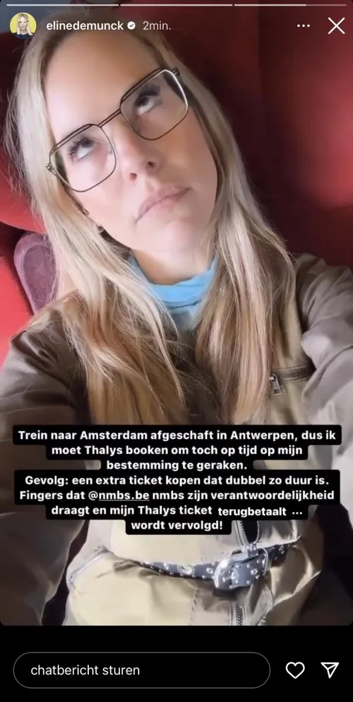 Ook haar trein naar Amsterdam werd afgeschaft. “Allee, dat begint hier al goed. Altijd een plezier om met de NMBS te reizen. Not”, aldus Eline. Doordat de trein niet reed, moest ze een Thalys boeken om toch op haar bestemming te geraken. “Gevolg: een ticket dat dubbel zo duur is”, zegt ze al zuchtend.