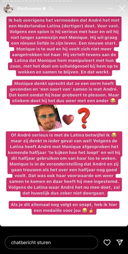 Zo verklapt ze dat ze het vermoeden heeft dat de zanger het met een Nederlandse latina van dertig jaar doet. “Volgens een spion is hij serieus met haar en wil hij niet langer samen zijn met Monique”, aldus de roddeltante. “Hij wil graag een nieuwe liefde in zijn leven. Een nieuwe start”, klinkt het. Yvonne betwijfelt of André serieus is met zijn nieuwe vlam, maar zij denkt alvast van wel.
