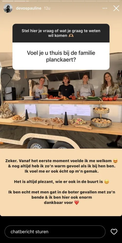Bijna twaalf maanden later zijn Pauline en Junior nog altijd dolverliefd, maar Pauline kan het ook goed vinden met zijn familie. Zo krijgt ze de vraag of ze zich thuisvoelt bij de Planckaerts en daar geeft ze een eerlijk antwoord op. “Zeker. Vanaf het eerste moment voelde ik me welkom”, geeft ze toe.