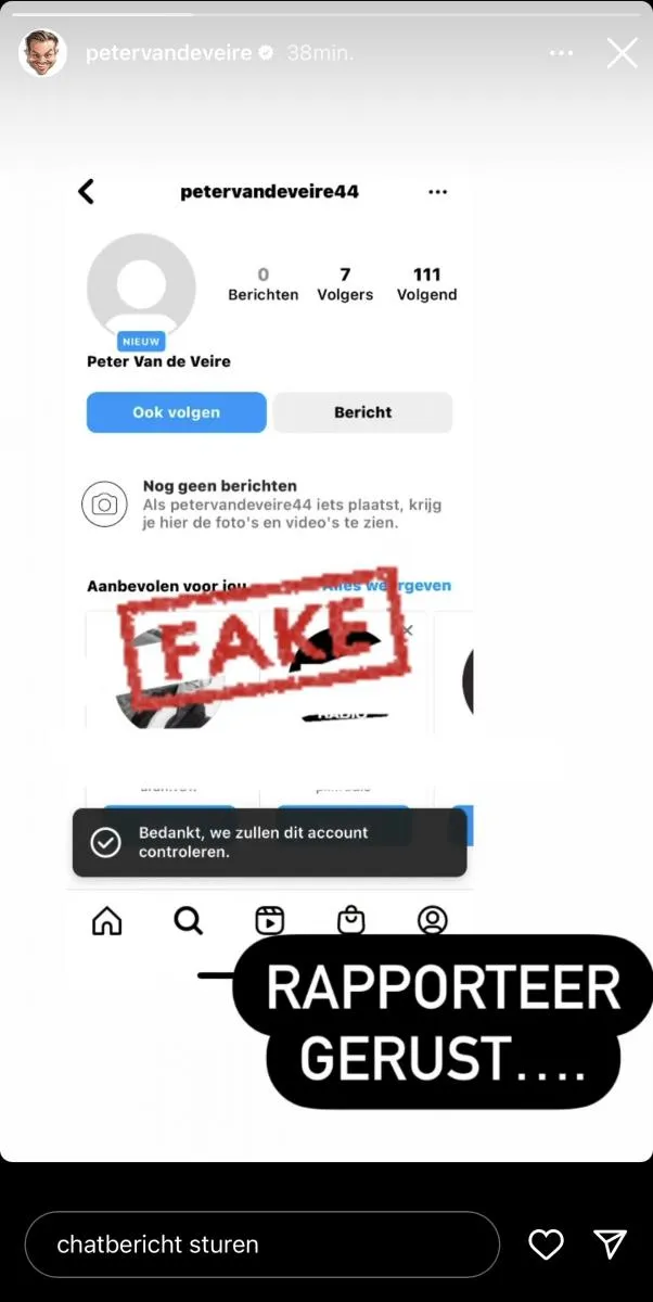 Op zijn Instagramverhaal legt hij uit wat er juist aan de hand is. Zo post hij een screenshot van het beruchte Instagramprofiel met de naam ‘petervandeveire44’. “FAKE”, schrijft hij er in het groot bij.