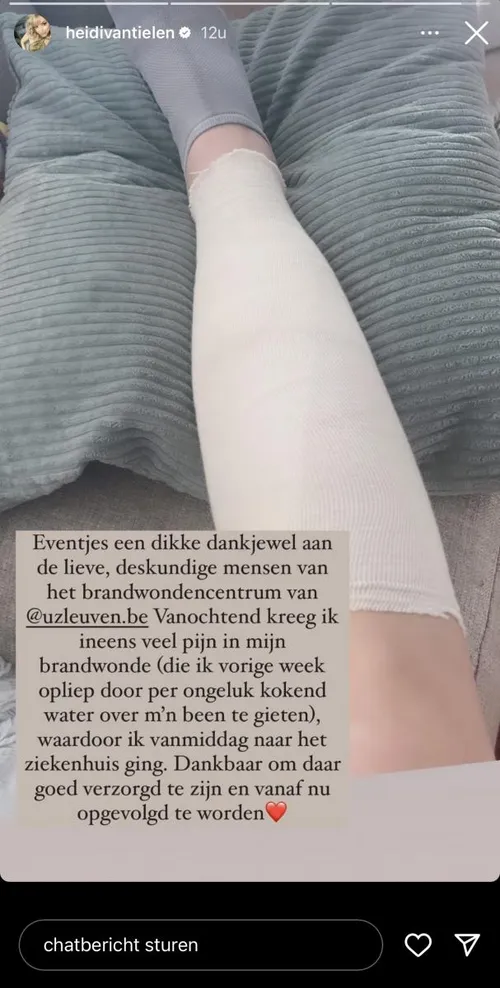 Heidi Van Tielen deelde enkele dagen geleden nog triest nieuws. “Ik heb vandaag in m’n eigen hand gebeten van de pijn”, schreef ze toen op haar Instagramverhaal. De presentatrice legde ook meteen uit wat er aan de hand was. “Kokend water over mijn scheenbeen laten vallen”, klonk het. Erg pijnlijk en daarom besloot ze om naar de dokter te gaan.