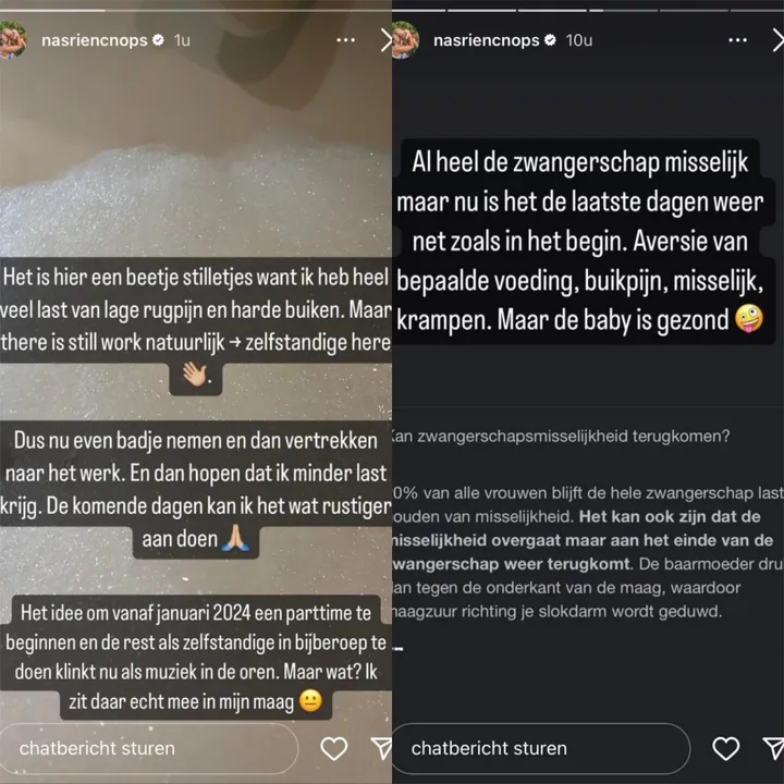 Helaas laat Nasriens gezondheid haar nu wat in de steek. “Het is hier een beetje stilletjes, want ik heb heel veel last van lage rugpijn en harde buiken”, laat de radiostem weten op Instagram. “Dus nu even een badje nemen en dan hopen dat ik minder last krijg. Gelukkig kan ik het de komende dagen wat rustiger aan doen.” Maar ook de misselijkheid speelt haar parten. “Al heel de zwangerschap misselijk, maar de laatste dagen is het weer net zoals in het begin”, klinkt het niet al te positief.