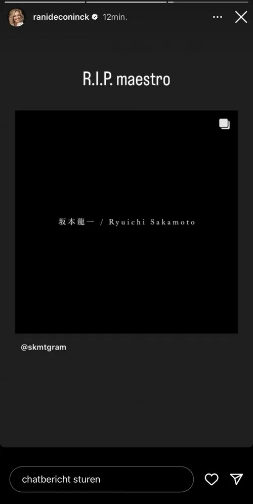 Rani De Coninck heeft zopas hartverscheurend nieuws vernomen. De bekende Japanse componist, muziekproducer en filmacteur Ryuichi Sakamoto is enkele dagen geleden overleden. Op haar Instagramverhaal deelt ze nu een mooi bericht.