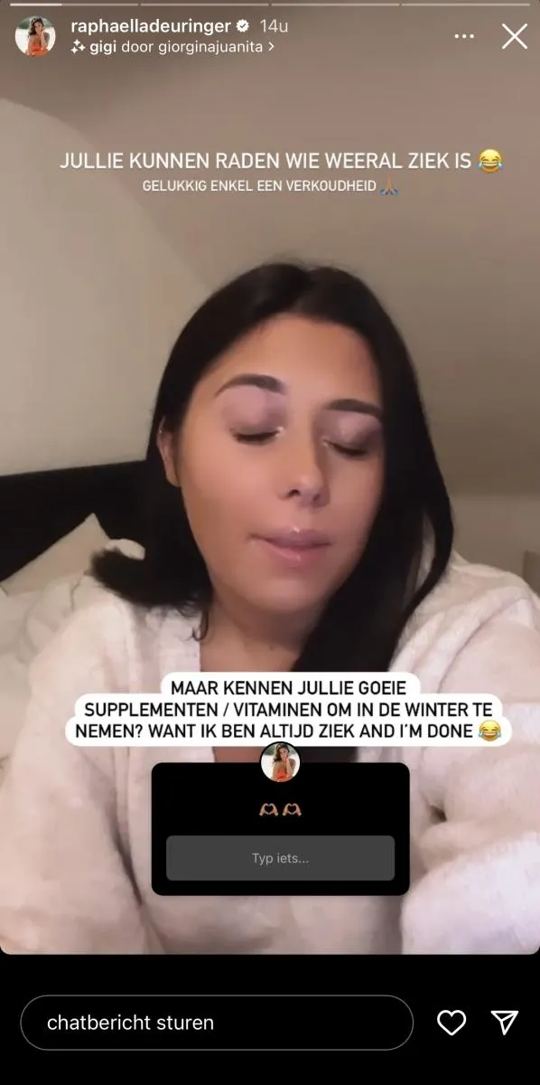 Bovendien is het ook geen corona. “Ik heb een test gedaan. Gelukkig negatief”, bekent ze. Toch vindt ze het niet normaal dat ze heel vaak ziek is. “Ik ben al 23 jaar heel de winter ziek, dat is irritant dus ik heb jullie hulp echt even nodig”, vertelt Raphaëlla. Haar volgers kunnen tips achterlaten voor vitamines en supplementen.
