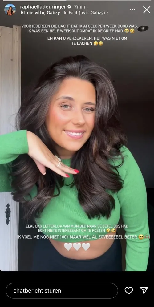 “Voor iedereen die dacht dat ik afgelopen week dood was…”, begint ze op haar Instagramverhaal. “Ik was een hele week out omdat ik de griep had”, verduidelijkt Raphaëlla. Volgens haar was dat allesbehalve een pretje. “Ik kan je verzekeren: het was niet om te lachen”, geeft ze eerlijk toe.