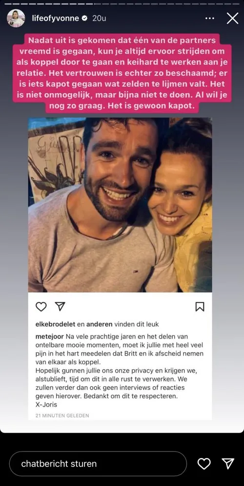 De juicekoningin moet meteen wat kwijt over deze post van Metejoor. “Nadat uit is gekomen dat één van de partners vreemd is gegaan, kun je altijd ervoor strijden om als koppel door te gaan en keihard te werken aan je relatie”, begint Yvonne. “Het vertrouwen is echter zo beschaamd, er is iets kapot gegaan wat zelden te lijmen valt”, schrijft ze. “Het is niet onmogelijk, maar bijna niet te doen. Al wil je nog zo graag. Het is gewoon kapot”, besluit Coldeweijer.