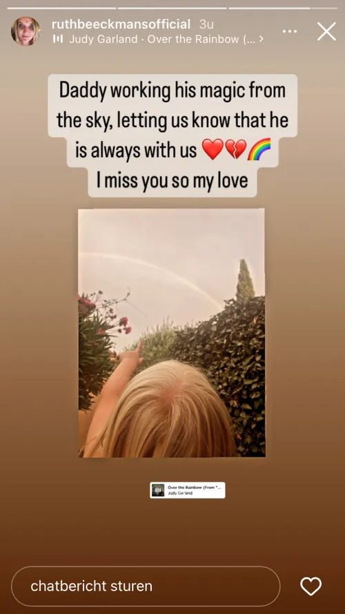 Ruth deelde een foto van een van haar dochters die naar de regenboog wees. “Papa is bezig met magie vanuit de hemel”, schrijft de actrice erbij. “Hij laat ons weten dat hij altijd bij ons is. Ik mis je zoveel, mijn liefde."