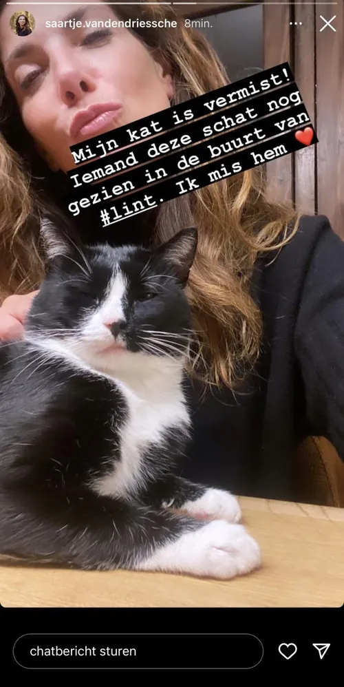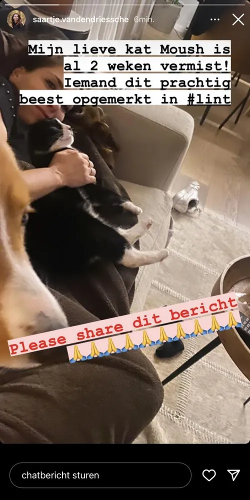 Zelf heeft ze ook enkele huisdieren, maar daar heeft ze nu minder goed nieuws over. Op haar Instagramverhaal vertelt ze nu wat er juist aan de hand is. Een van haar katten is namelijk spoorloos. “Mijn lieve kat Moush is al 2 weken vermist”, schrijft ze radeloos.