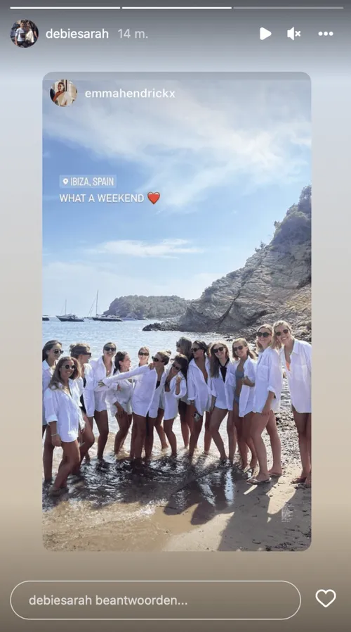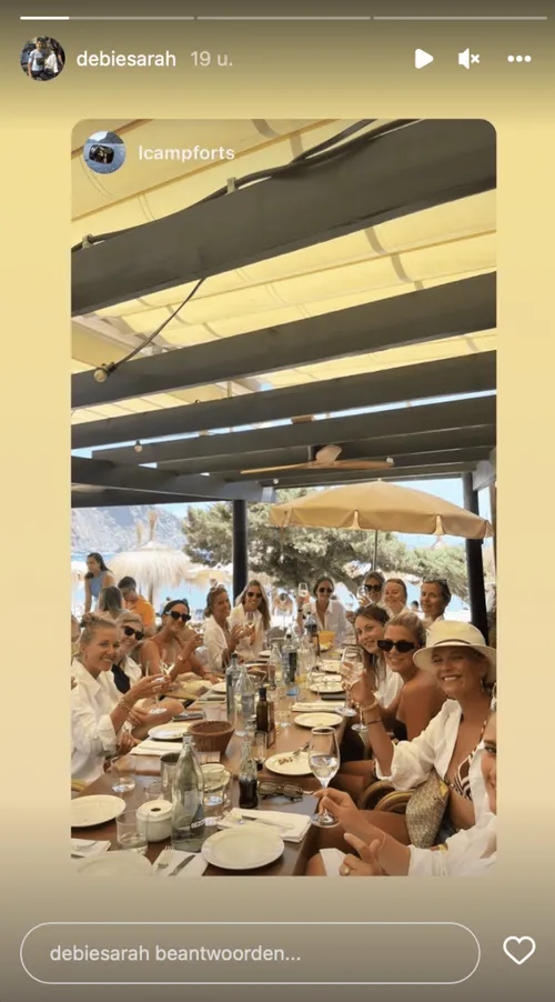 Het vrijgezellenfeest met allemaal dames ging door in Ibiza. Sarah deelde er sfeerbeelden van op Instagram Stories en liet zo haar volgers dus meegenieten. Wout van Aert was dus even alleen thuis.