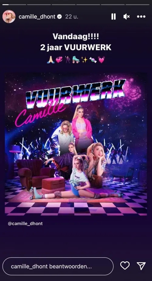 Camille Dhonts carrière gaat als een sneltrein. De 21-jarige zangeres scoort hit na hit, verkoopt verschillende Lotto Arena’s uit en is niet meer uit de Vlaamse muziekwereld weg te denken. Maar even terug naar waar haar solocarrière helemaal begon, met ‘Vuurwerk’. Het was gisteren precies twee jaar gelden dat ze haar monsterhit op de wereld losliet. “Vandaag! 2 jaar ‘Vuurwerk’!”, schreef de zangeres op haar Instagramverhaal. De rest is geschiedenis.