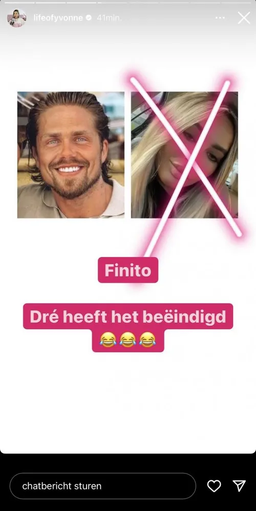 Echter laat Yvonne dat helemaal niet aan haar hart komen, want de roddeltante heeft nu al weer een primeur over André beet. “Spionnen, hebben jullie zin in een verse, juicy scoop?”, schrijft ze op haar Instagramverhaal met enkele lachende smileys. “Finito. Dré heeft het beëindigd”, aldus Yvonne.