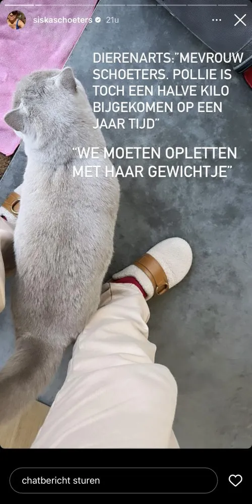 Daar dacht Siska’s dierenarts toch anders over. Die had namelijk helemaal niet zo’n goed nieuws voor Siska. Daar vertelt ze meer over op haar Instagramverhaal terwijl ze een foto toont van Pollie. “Mevrouw Schoeters, Pollie is toch een halve kilo bijgekomen op een jaar tijd”, kreeg Siska te horen.