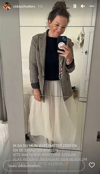Op Instagram toont Siska Schoeters nu een van die veranderingen. Ze deelt een foto van zichzelf voor de spiegel, mooi opgemaakt tot in de puntjes. "Ik ga nu mijn watermeter zoeken en de stand doorgeven", laat ze weten. "Iets wat ik nog nooit heb gedaan. Elke reden is inderdaad een reden om je feestelijk op te kleden”, gaat de radiopresentatrice grappend verder.